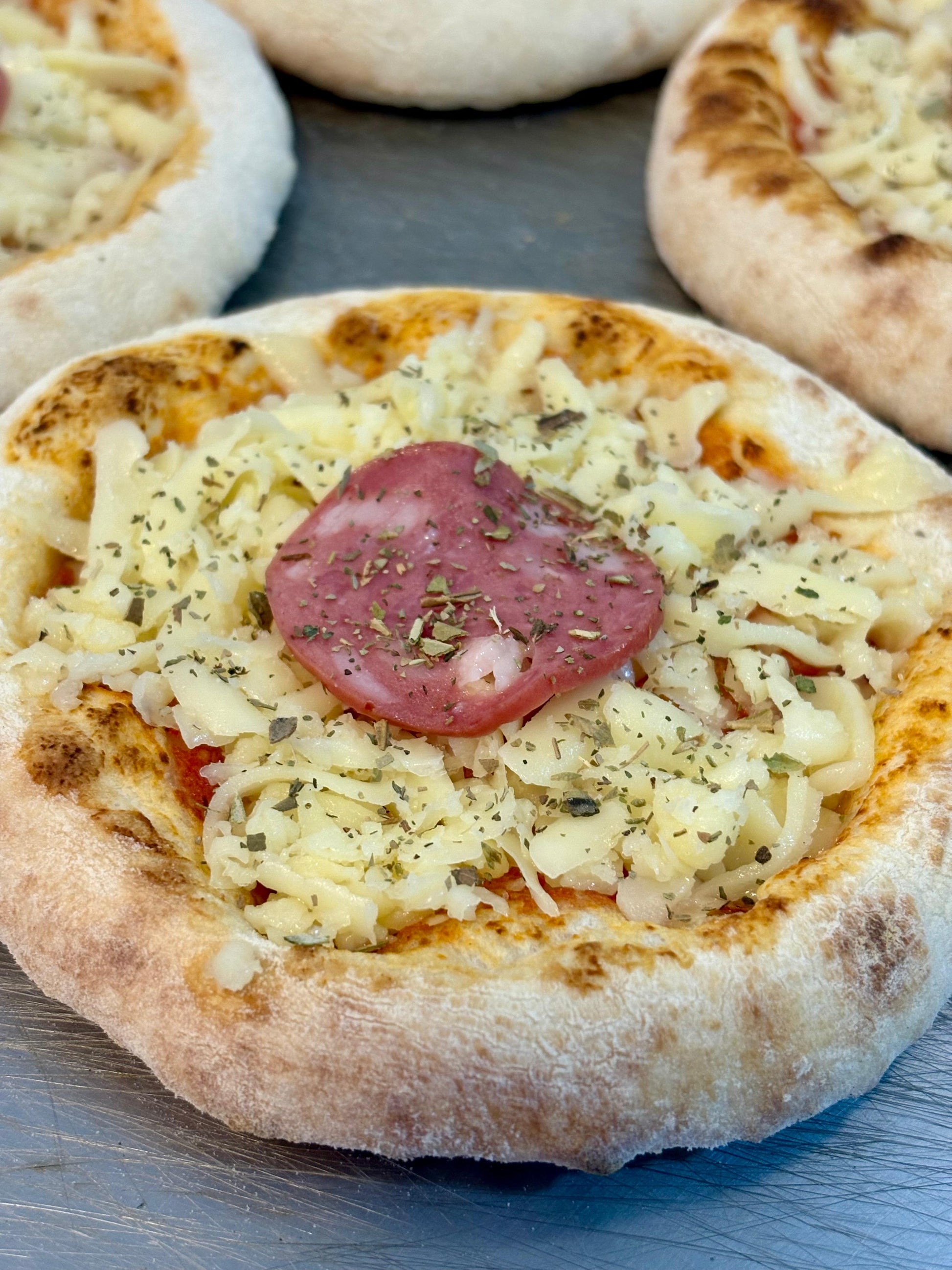 16 mini pizzas (maiores que as mini pizzas tradicionais de festas, as nossas tem cerca de 11/12cm) de massa de longa fermentação, molho de tomate (que leva apenas tomate pelati, manjericão, alho e sal), mozzarella premium, calabresa e orégano.