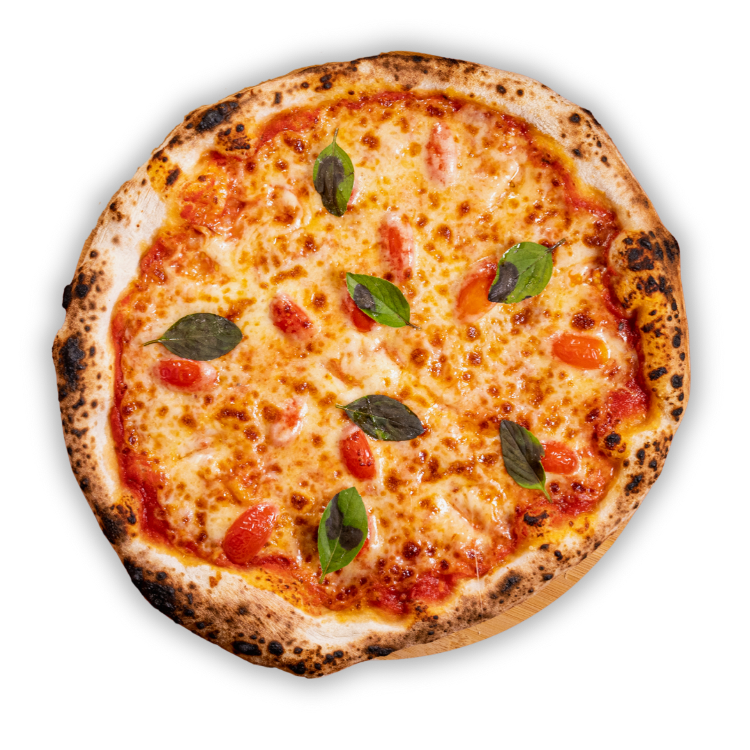 Massa pré-assada de longa fermentação com farinha italiana, molho de tomate pelati com alho e manjericão fresco, muçarela especial, tomate cereja e manjericão.
