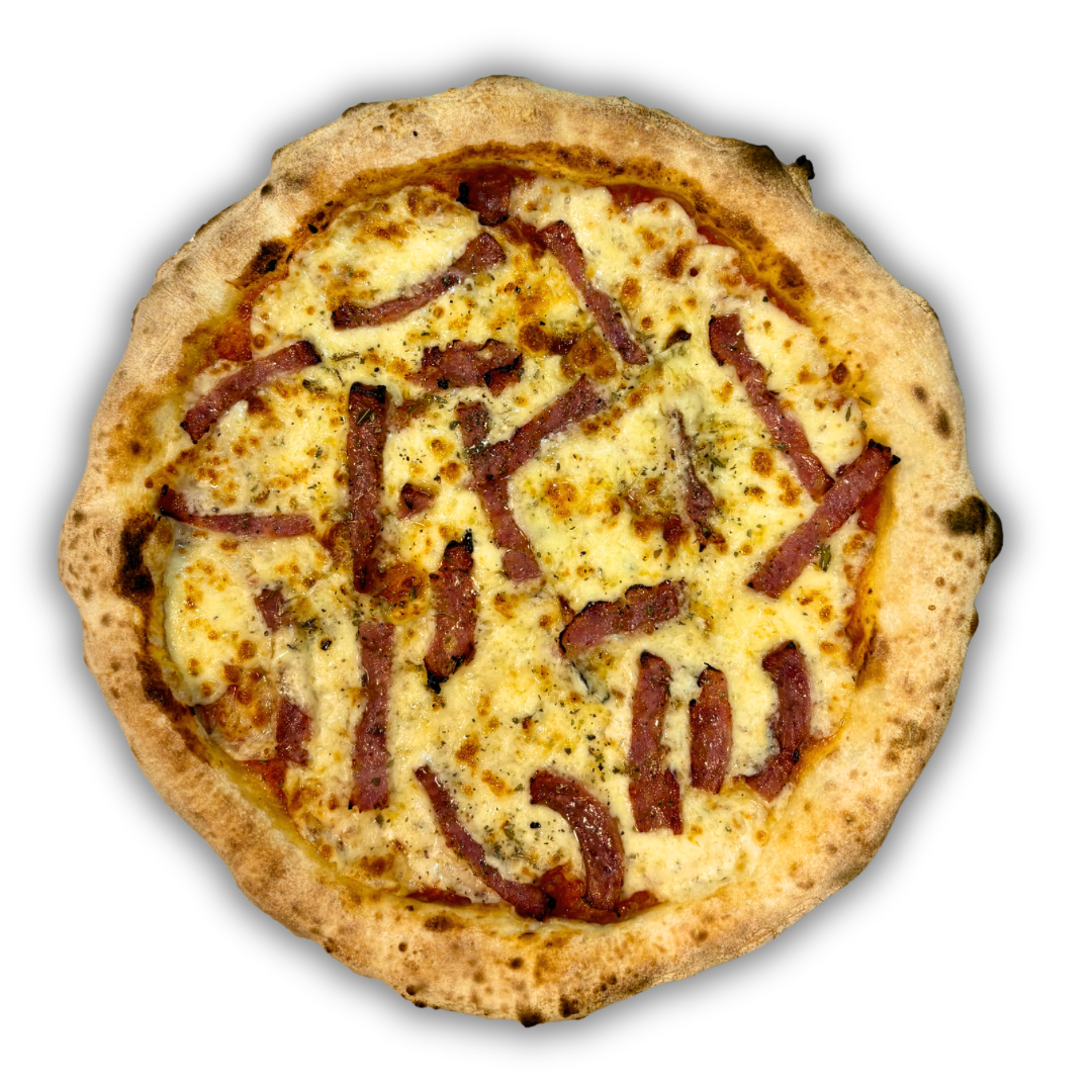 Massa pré-assada de longa fermentação com farinha italiana, molho de tomate pelati com alho e manjericão fresco, muçarela, salame e orégano.